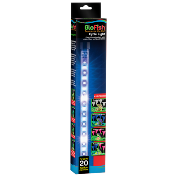 The GloFish Cycle Light uses color changing lights to provide you with four unique light modes. Each mode enriches the color of your décor and fish in bold and exciting ways. Make your colorful companions the highlight of your home by enhancing your GloFish environment. Simply clip the LED light into the front of the aquarium frame and experience the Glo today!